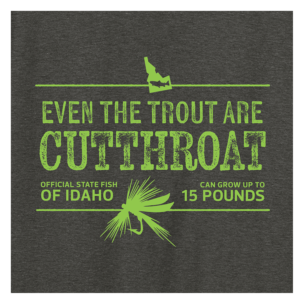The “Even The Trout are Cutthroat” design is printed locally in Idaho on a District Perfect Tri Tee, 4.54 ounce, short-sleeve uni-sex t-shirt. The material is made of 50/25/25 poly/combed ring spun cotton/rayon. Each shirt has a tear away label for easy removal.