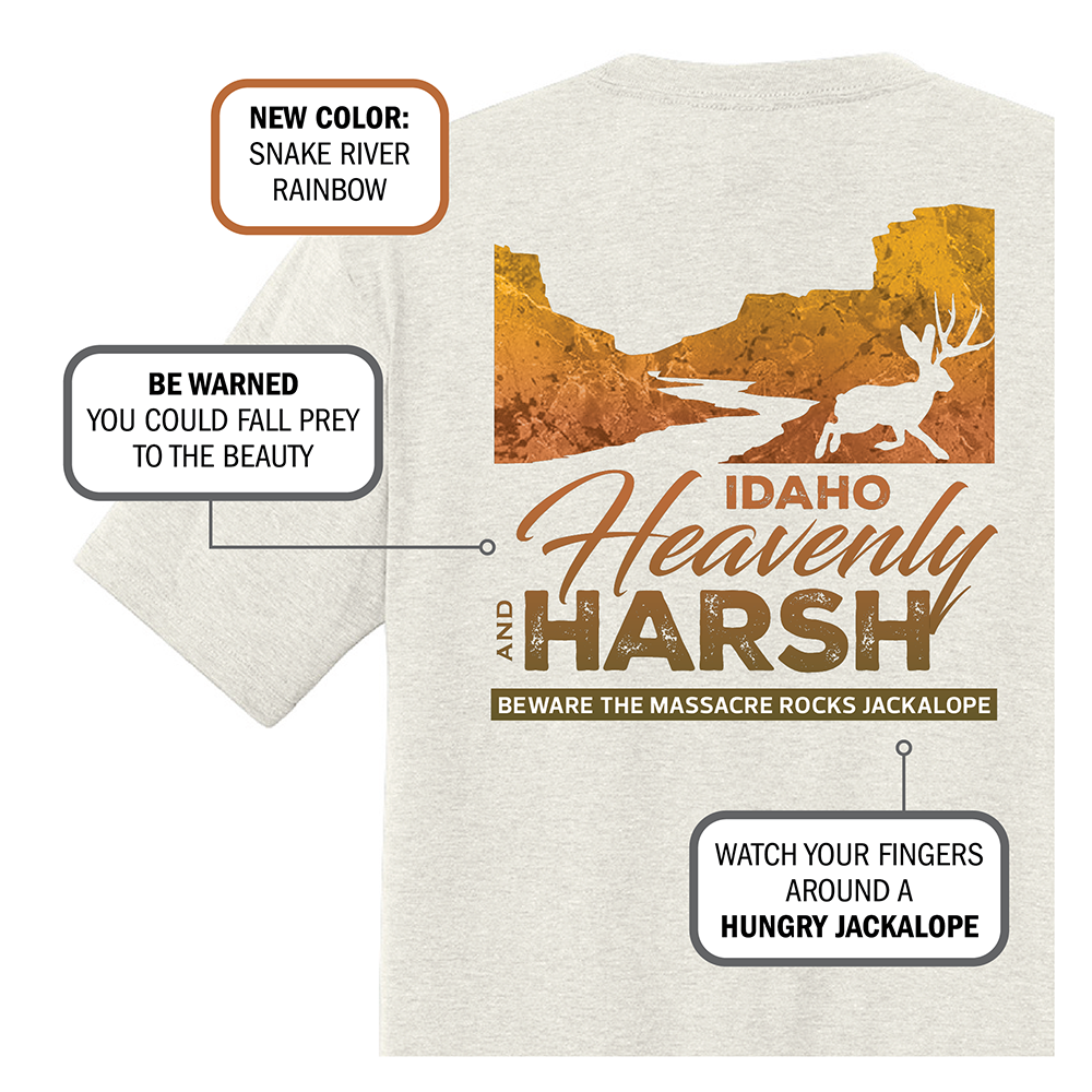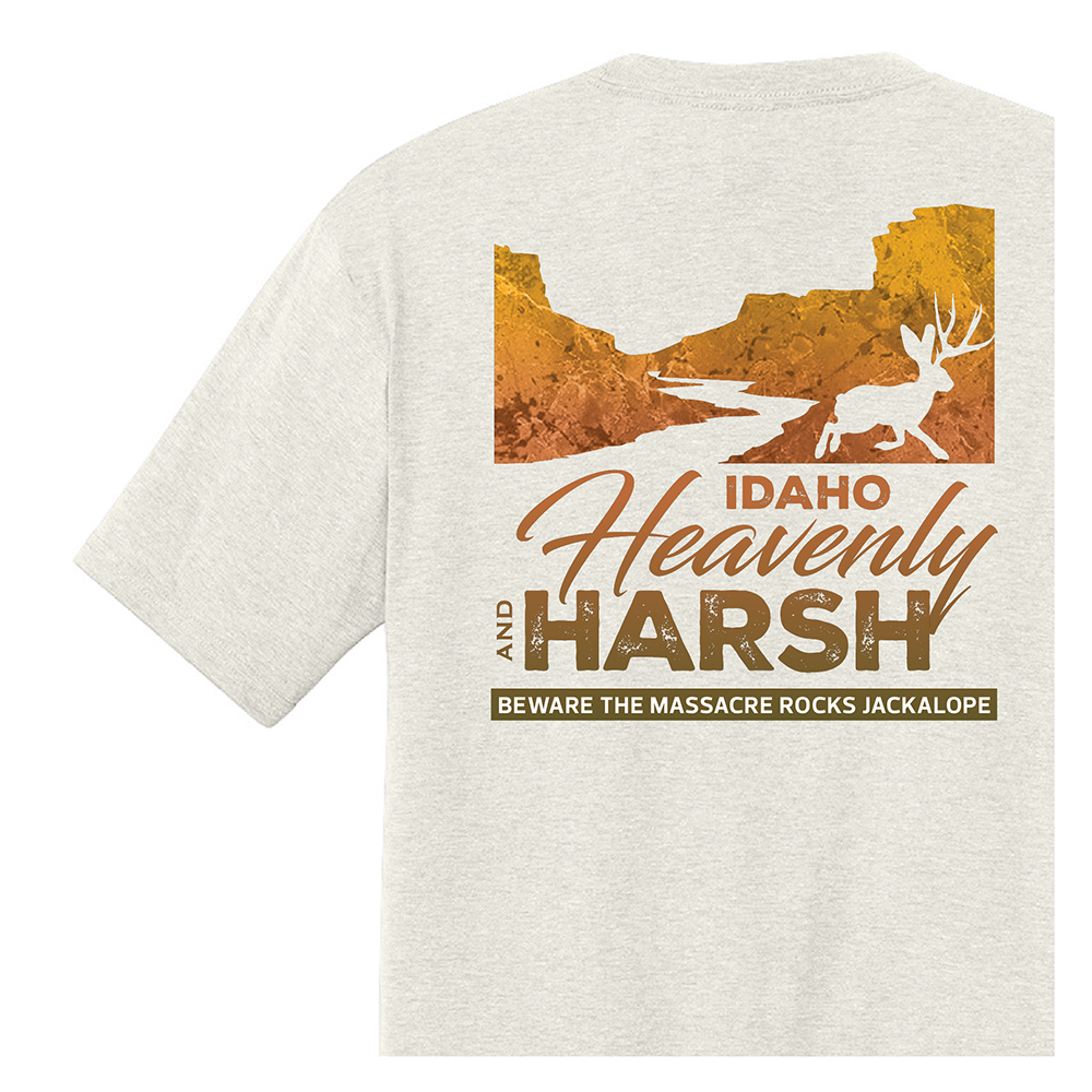 The “Massacre Rocks Jackalope” design is printed locally in Idaho on a District Perfect Tri Tee, 4.54 ounce, short-sleeve uni-sex t-shirt. The material is made of 50/25/25 poly/combed ring spun cotton/rayon. Each shirt has a tear away label for easy removal.