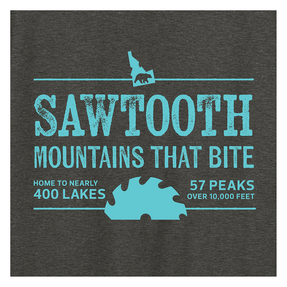 The “Sawtooth Mountains that Bite” design is printed locally in Idaho on a District Perfect Tri Tee, 4.54 ounce, short-sleeve uni-sex t-shirt. The material is made of 50/25/25 poly/combed ring spun cotton/rayon. Each shirt has a tear away label for easy removal.