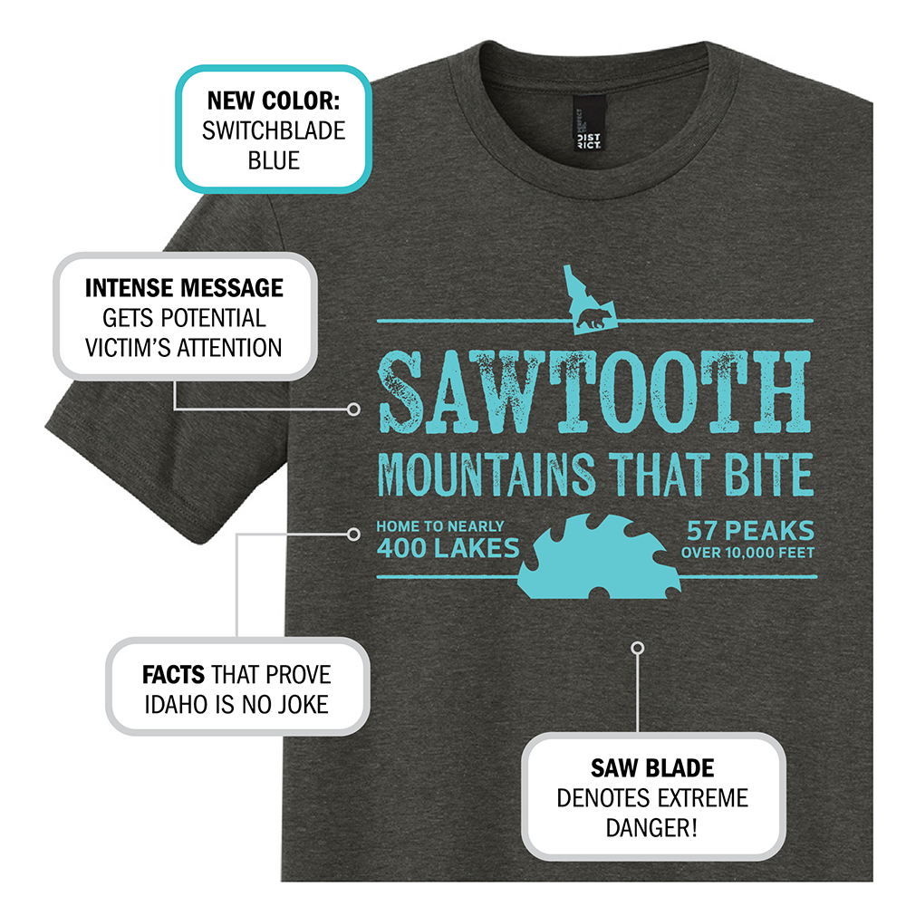 The Sawtooth Mountain range boasts over 700 miles of trails, 57 peaks over 10,000 feet and nearly 400 alpine lakes. There is a history of alpine glaciation, but while no surface glaciers exist today, perennial snow fields and rock glaciers remain, usually on north or east facing slopes. Creek crossings are probably the most dangerous thing about going Into the Sawtooths, not the bears or the lightning strikes.This t-shirt warning is available now in our new “switchblade blue” ink color. (Disclaimer: ink does not contain sharp edges)