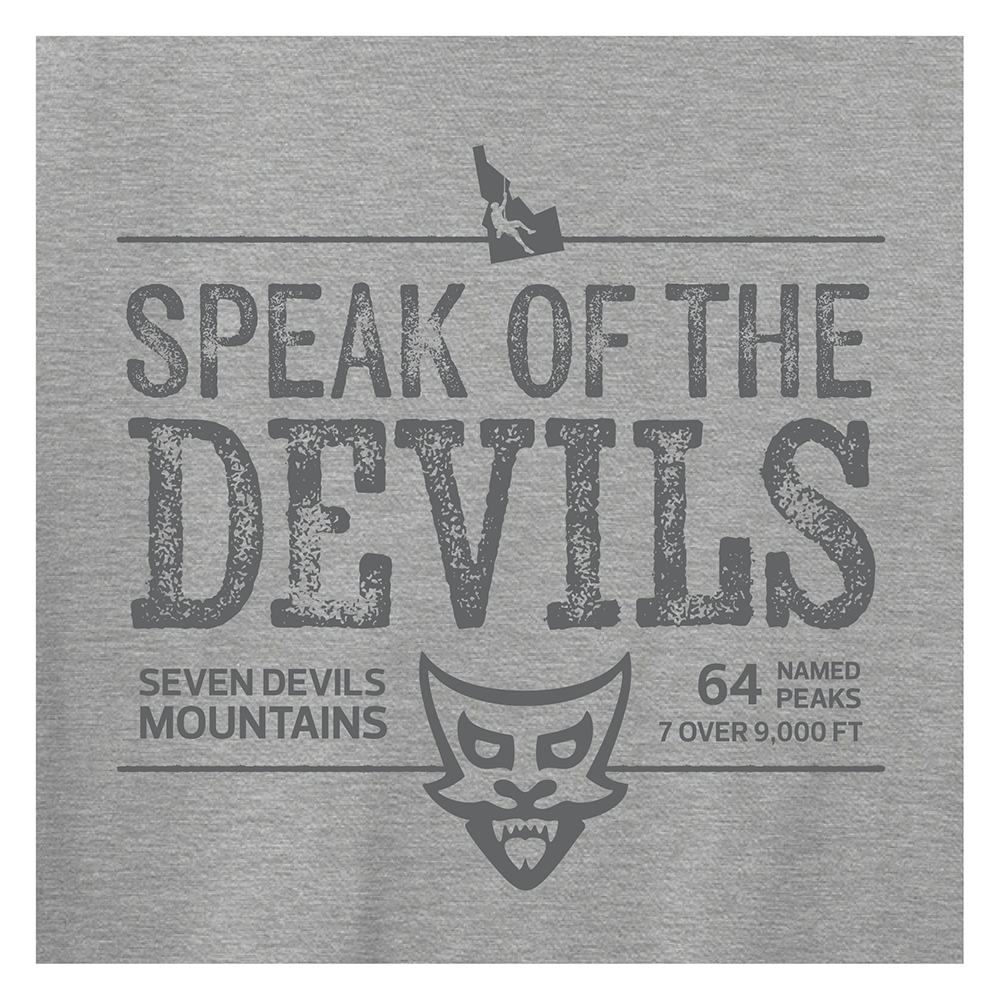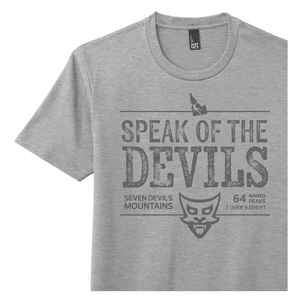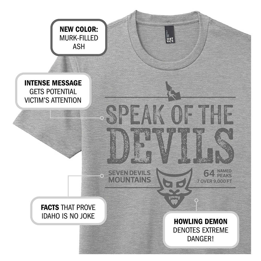 The “Speak of the Devil” design is printed locally in Idaho on a District Perfect Tri Tee, 4.54 ounce, short-sleeve uni-sex t-shirt. The material is made of 50/25/25 poly/combed ring spun cotton/rayon. Each shirt has a tear away label for easy removal.